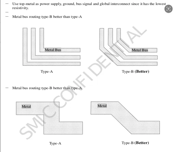 很多时候大家会把 Design Manual 当成“有问题再去查”的东西。也就是说,Design Manual 不只是告诉你“不能错”,还会帮助你慢慢理解“为什么这样做更合适”。下面是smic某工艺里面对电源敏感信号线的建议(还有很多,但怕侵权所以只贴一小部分做解释说明)。