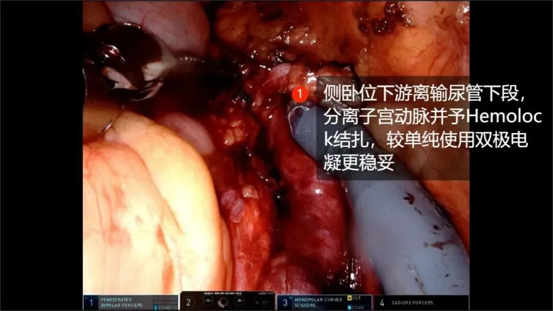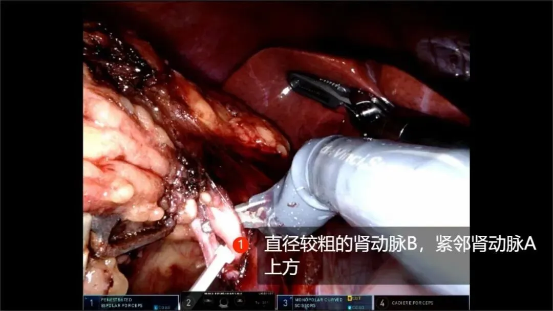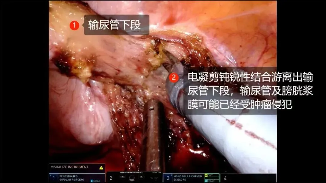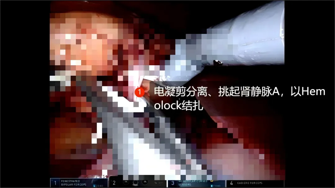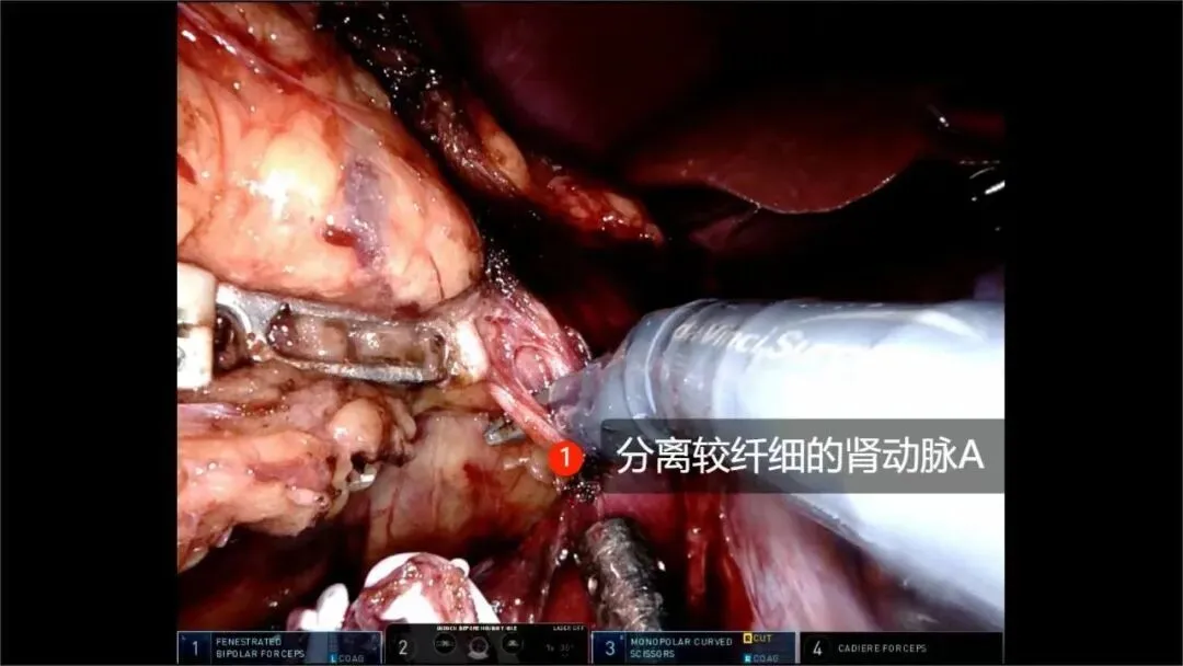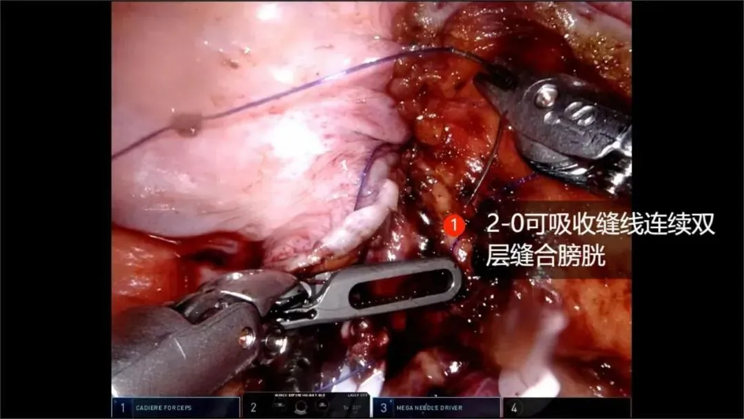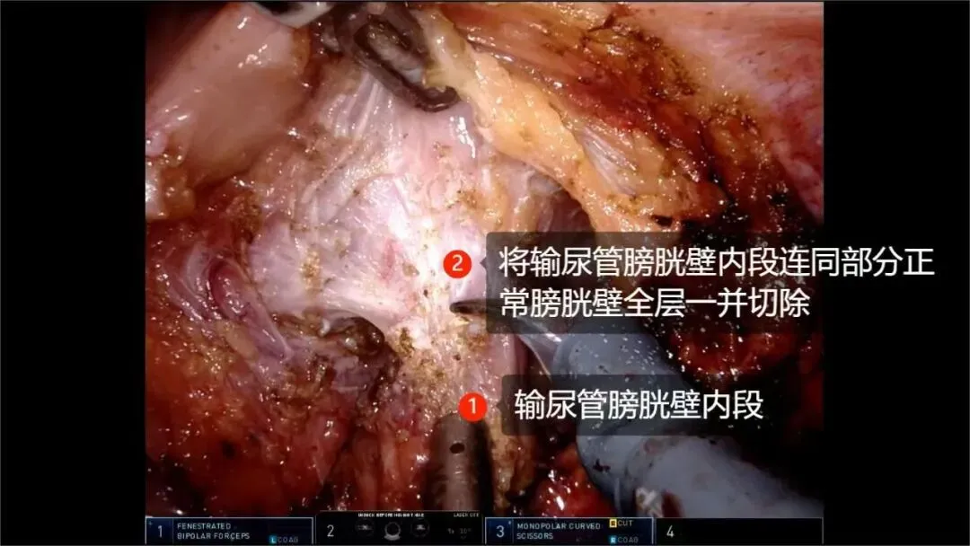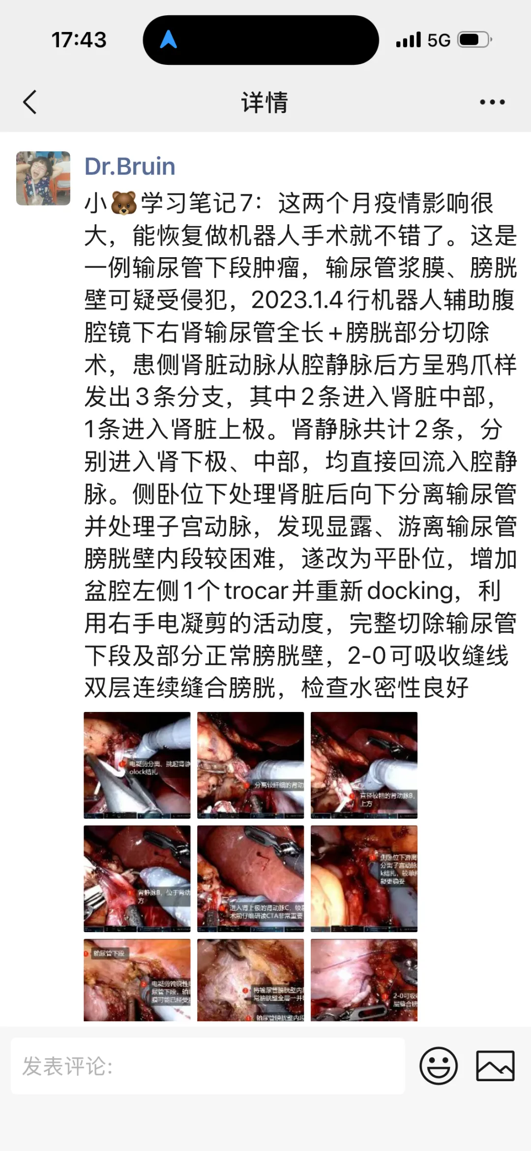 这两个月疫情影响很大,能恢复做机器人手术就不错了。这是一例输尿管下段肿瘤,输尿管浆膜、膀胱壁可疑受侵犯,2023.1.4行机器人辅助腹腔镜下右肾输尿管全长+膀胱部分切除术,患侧肾脏动脉从腔静脉后方呈鸦爪样发出3条分支,其中2条进入肾脏中部,1条进入肾脏上极。肾静脉共计2条,分别进入肾下极、中部,均直接回流入腔静脉。侧卧位下处理肾脏后向下分离输尿管并处理子宫动脉,发现显露、游离输尿管膀胱壁内段较困难,遂改为平卧位,增加盆腔左侧1个trocar并重新docking,利用右手电凝剪的活动度,完整切除输尿管下段及部分正常膀胱壁,2-0可吸收缝线双层连续缝合膀胱,检查水密性良好。