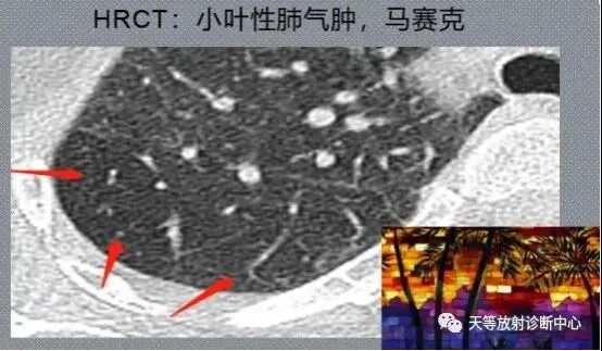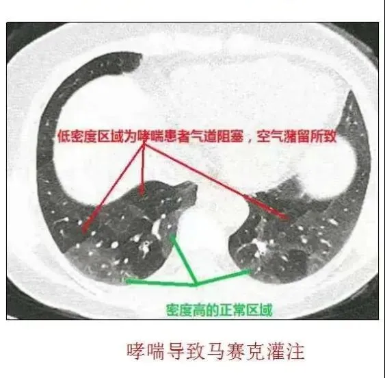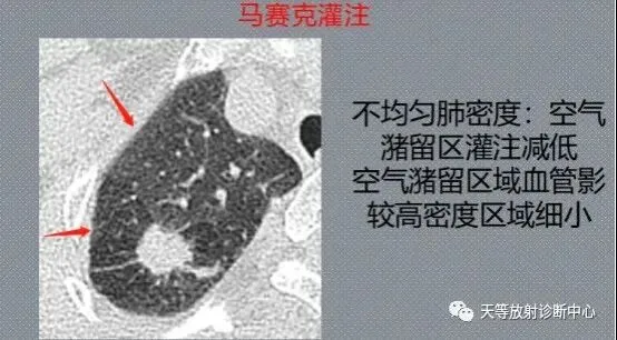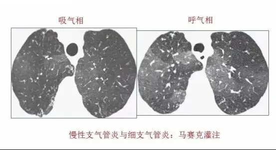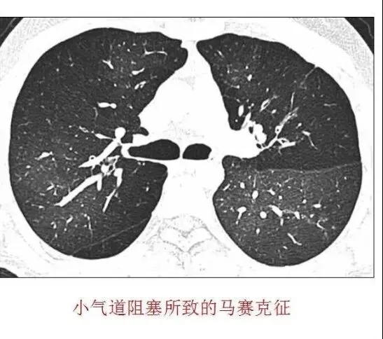 (1)气道性疾病:在气道性疾病中马赛克征的出现是由于呈补丁样分布的狭窄性毛细支气管炎和增殖性毛细支气管炎的病理改变造成局部缺氧血管痉挛,使局部血流灌注减少而形成的斑片样分布的气体潴留征象,影像表现为透亮度增高。即需要明确的是:从HRCT上看,病变区域是透亮度增高的区域,而不是透亮度降低的区域。以肺透亮度增高为异常表现,边缘清晰,血管管径缩小,呼气相可见空气潴留。