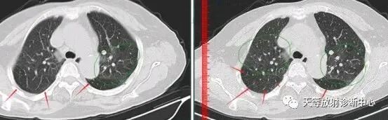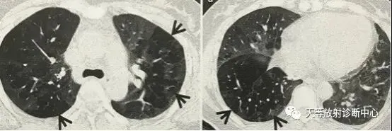 (6)石棉肺:石有人认为常规CT扫描在早期发现接触石棉的人群的胸膜增厚及肺实质纤维化等方面比常规X线胸片有明显更高的敏感性。高分辨率CT的诊断价值可能更大。在显示胸膜斑与肺实质性纤维化中,HRCT比常规CT具有更高的敏感性。同时一些研究也显示HRCT对一些普通胸片正常的患者可以发现其胸膜上的及肺实质内的异常。石棉肺在HRCT上的特征性表现包括:长度不等和胸膜平行的线条状阴影及马赛克征;肺内贯通着长度为2〜5cm的线条影,并可延伸到胸膜的表面;小叶间隔线的增厚以及次级肺小叶结构的增厚;蜂窝样肺改变。
