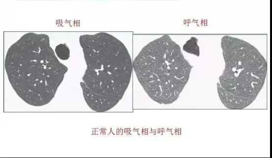 间接征象:病变小气道远端肺实质异常,主要表现为吸气相马赛克衰减和呼气相空气潴留。空气潴留表现为肺实质区域衰减增加程度低于正常,且无容积减少,边缘锐利,符合次级肺小叶轮廓。