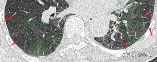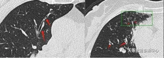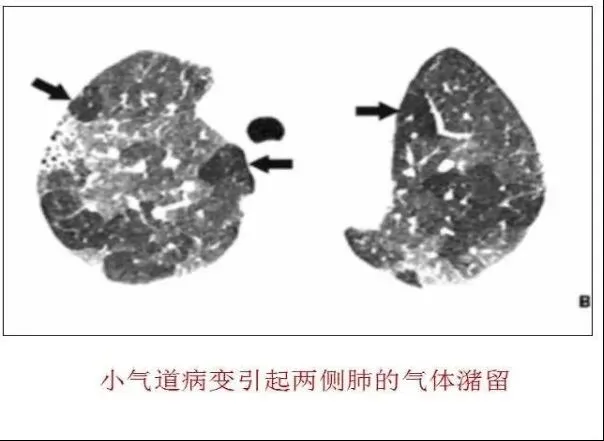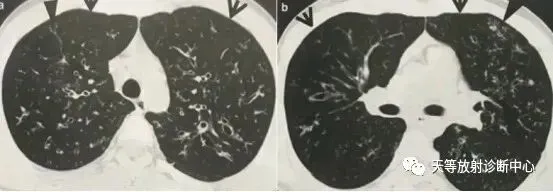 (2)弥漫性泛细支气管炎:病理改变主要影响呼吸性细支气管,以管壁内单核细胞浸润和肺泡管、肺泡囊及其相邻肺泡出现泡沫巨噬细胞为特征。HRCT扫描表现为以小叶中心结节影和分支线样阴影,以及进行性细支气管扩张等,也可表现为继发于细支气管腔狭窄所致的气体潴留造成的低密度区。