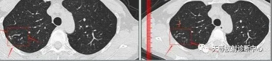 (2)弥漫性泛细支气管炎:胸部HRCT对诊断弥漫性泛细支气管炎更有帮助,其主要表现为两肺呈弥漫分布小叶中心可见的小结节影,直径2~5mm,边缘稍模糊。主要为两下肺叶及肺外带显著;双肺外带见树芽征表现。小支气管与细支气管扩张,支气管壁增厚,肺内可见结节影、线状影、高密度黏液栓等。
