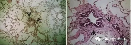 增殖性细支气管炎:病变从气道壁内部发生,炎症细胞填充管腔,多可逆。