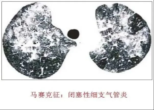(3)闭塞性细支气管炎:表现为:马赛克样实变;支气管壁增厚和(或)支气管扩张;呼气时气体潴留征;肺实变或肺不张;闭塞性细支气管炎感染后可见黏液栓;网状结节影;树芽征等。
