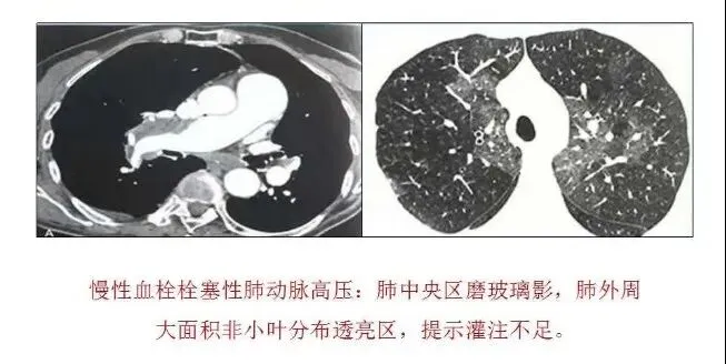(1)肺栓塞:直接征象:主肺动脉和左、右肺动脉及其叶段分支管腔内形态各异的充盈缺损,即血栓。间接征象有肺叶、段在肺窗上的马赛克征、磨玻璃征、肺动脉增宽、肺不张和胸腔积液、心包积液等。