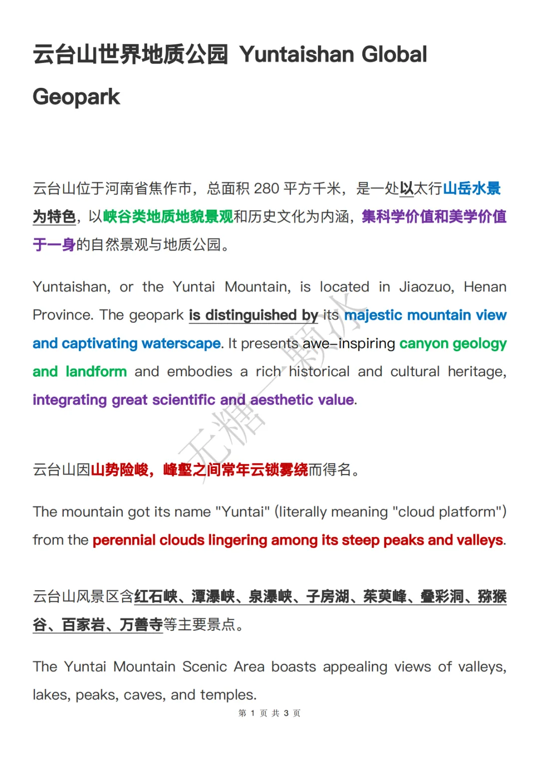 1. 云台山世界地质公园 Yuntaishan Global Geopark(全文核心专有名词,UNESCO官方定名,自然遗产类文本必考核心词)