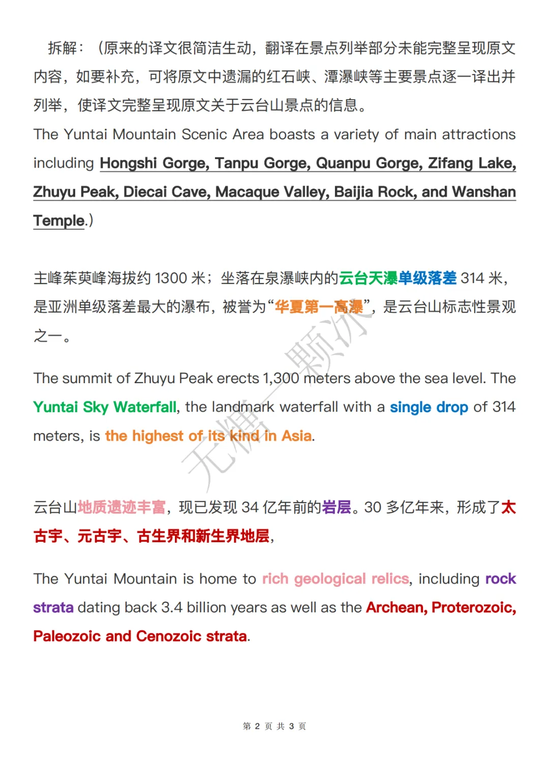 1. 文化地名补充说明:具有字面含义的中文地名,需在拼音后加括号补充literally meaning...,这是自然遗产类文本翻译的核心得分点;