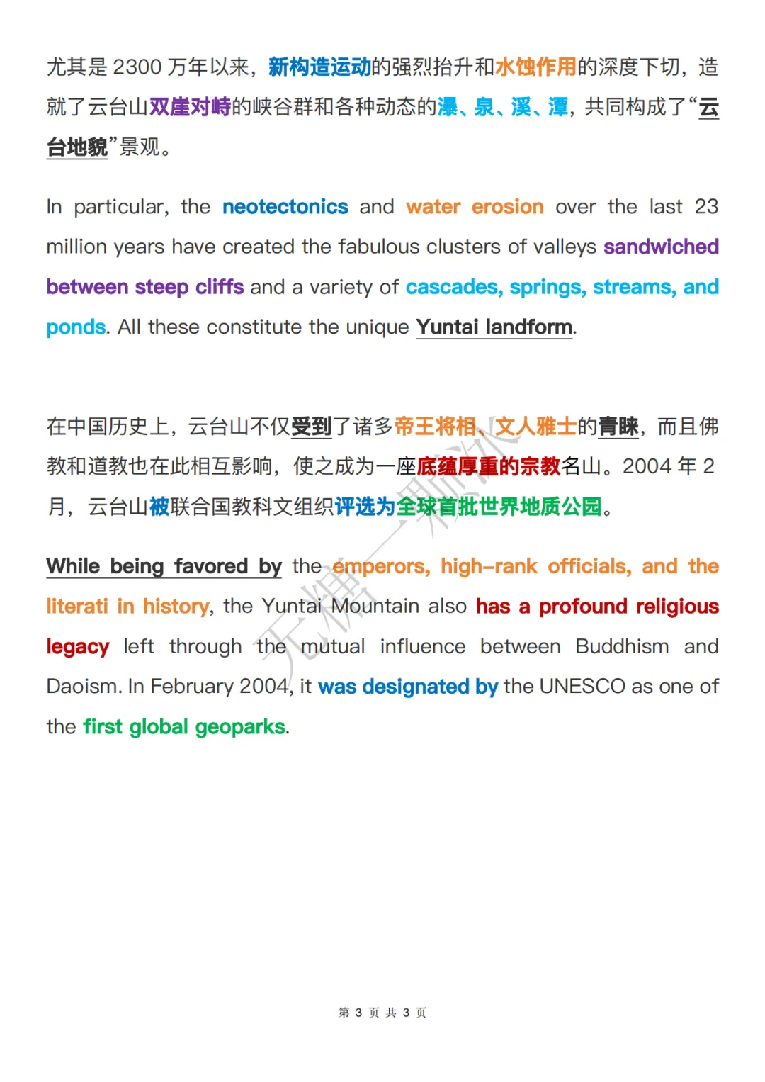 今日分享短文【云台山世界地质公园】中英双语学习笔记。 基于官方中英双语原文, 提炼20个核心词汇/固定搭配、 拆解5个长难句并附翻译技巧, 内容词汇句式比较简单。一、20个固定词汇搭配与高频核心词
