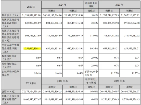 2025年,公司实现营业收入2,139,987.89万元,同比增长5.01%;营业成本1,886,551.15万元,同比增长3.67%;期间费用150,596.23万元,同比增长9.05%,其中研发投入35,569.91万元,同比增长5.68%;归属于上市公司股东的净利润82,707.94万元,同比增长2.81%;经营活动产生的现金流量净额125,666.78万元,同比增长99.36%。