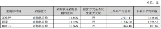 国内尿素产能持续投放,市场供给宽松,尿素价格重心下移,公司采购均价较上年同期下降。