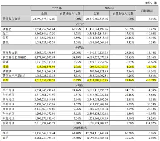 公司自成立以来专注于复合肥的研发、生产和销售,并沿着复合肥上游原料氮、磷元素进行产业链的深度开发,通过多年的资源整合、产能建设和市场拓展,现已建成从上游盐矿、磷矿资源到下游氮、磷完整产业链,形成磷复肥、磷化工、新能源材料和联碱业务协同发展的产业格局。公司主要产品包括复合肥、磷肥(磷酸一铵)、黄磷、磷酸铁、纯碱(联产氯化铵)等。