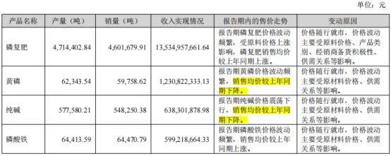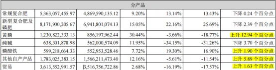 报告期实现磷复肥销量460.17万吨,同比增长10.10%,实现营业收入1,353,495.77万元,同比增长18.42%。公司新型肥料及磷肥实现营业收入817,190.02万元,同比增长22.16%。