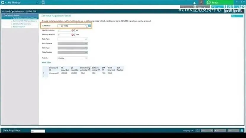 2.关联方法与化合物:在向导界面中,选择已建立的液相方法,并输入进样体积、采集时间以及需要优化的化合物离子对信息 [[液质联用]]。