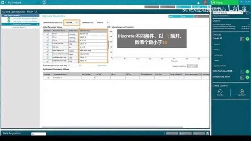l离散值测试(Discrete):直接输入多个待测试的特定数值,以分号隔开,建议数值个数少于10个 [[液质联用]]。该模式的设置界面清晰列出了如DP、CE、CXP、Source temperature等参数及其离散测试值 [[表†2|液质联用]]。