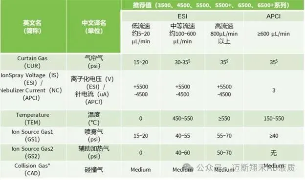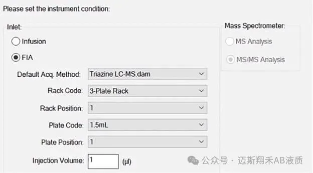 3.设定初始参数:完成仪器平衡后,进入初始参数设置步骤。初始的离子源参数可依据不同流速的推荐值进行设定 [[液质联用]]。此步骤的软件界面通常用于确认或输入化合物的质量数与初始电压参数 [[表†1|液质联用]]。