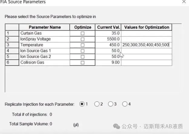 SCIEX OS 软件提供了引导式的离子源参数自动优化功能,尤其适用于多反应监测(MRM)方法开发。该流程通过软件向导,系统性地调整并确定关键源气参数的最优值,以提升目标化合物的色谱峰响应或信噪比 [[液质联用]]。