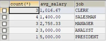 -- (1)显示每种岗位的雇员总数、平均工资。SELECT COUNT(*),FORMAT(AVG(sal),2AS avg_salary,job FROM empGROUP BY job