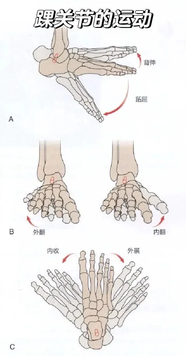 踝的旋转动作在内翻和外翻时伴随出现。内翻时,前足旋内。外翻时,前足旋外。友情提醒:以上内容为学习笔记分享,📝不够完善,因个体差异较大,不构成医疗意见,仅供参考学习,欢迎大家指正🤝
