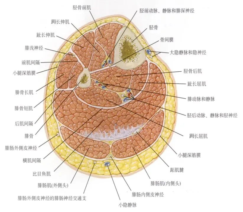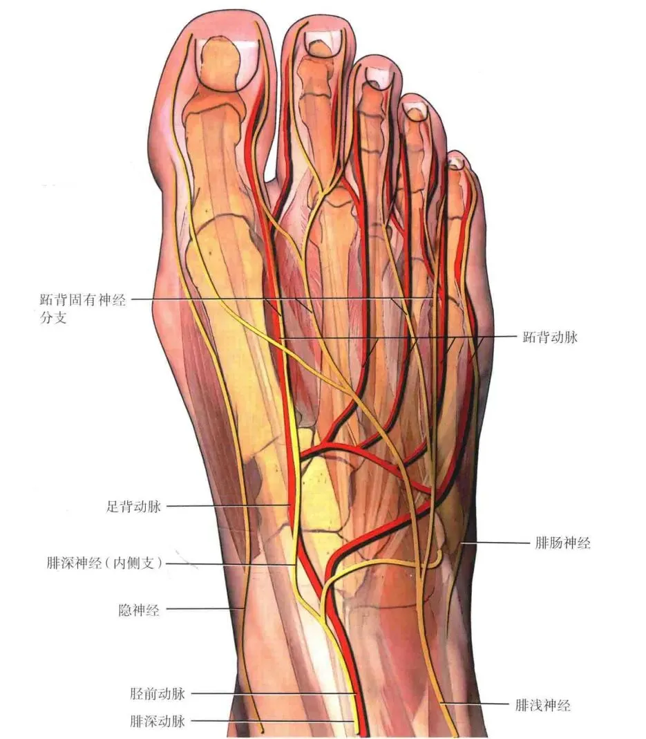 小腿前肌群长期紧张性收缩会出现小腿前侧痛,发生黏弹性紧张后,皮下筋膜张力增高,影响血液循环,易出现小腿前皮肤脱毛的现象。肌肉内压力增高造成腓总神经的软性压迫,使腓总神经冲动传导速度减慢,小腿前肌群在足跟落地时收缩无力,踝背屈能力下降,走路时前足拍击地面,产生足底肿胀。
