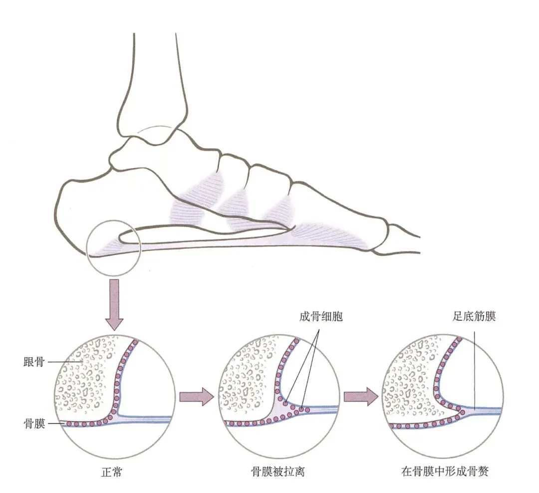 腓骨长肌、腓骨短肌兴奋,进行踝部平衡的重力拮抗,出现小腿外侧及足部附着点的疼痛。踇长伸肌、趾长伸肌长期的紧张状态会导致足踝上下支持带的牵拉和摩擦过多。滑囊的摩擦刺激使滑液产生增加,出现足背腱鞘囊肿。长期的牵拉与摩擦使支持带增厚,发生炎症后,出现足背痛。