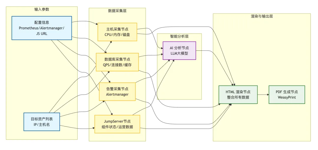 本方案采用的是“数据采集+智能分析+报告渲染”的分层架构设计,通过MaxKB工作流串联各个环节。该系统的核心组件包括: