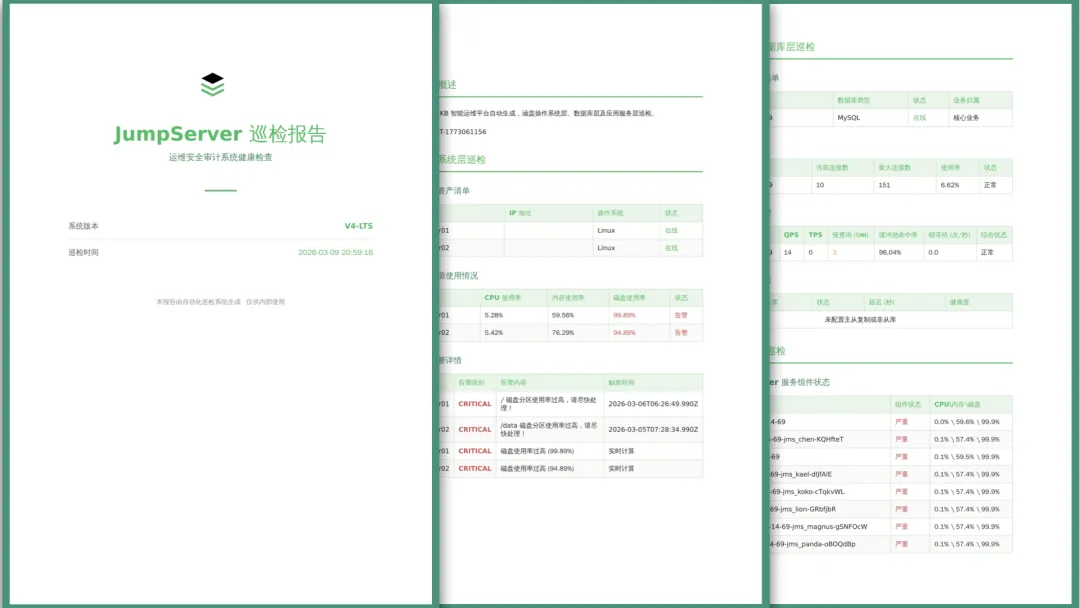 企业IT资产定期巡检是保障企业整体运维安全的关键环节。而传统的巡检模式存在诸多痛点。首先是费时费力,登录服务器、敲命令、查日志、看监控大盘,一台台机器折腾下来,半天时间就没了;然后是数据离散分布,技术指标(CPU、内存、数据库性能数据等)分散在Prometheus的各类监控面板中,而业务状态等非技术指标则记录在JumpServer等业务系统里,各系统之间缺乏关联,难以形成完整的资产健康视图;报告方面,不同的人执行巡检,得出的结论和报告格式往往五花八门,难以标准化和存档。而巡检操作通常也比较僵化,大部分的巡检报告只是数据的堆砌,缺乏对潜在风险的预判和根因分析。