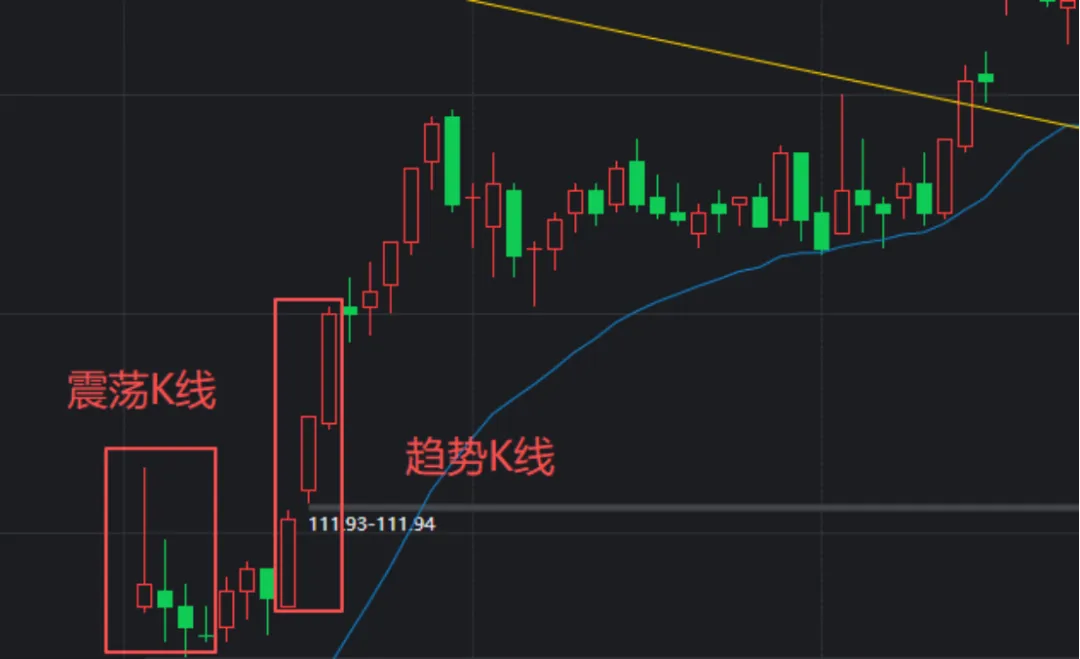 在价格行为学的理念中,每一根K线都包含信息,每一个价格变动都很重要,不存在无意义的“噪音”,因此交易者需要关注每一根K线背后向我们传达的信息。价格行为学将K线分为了两类,分别是趋势K线和震荡K线。趋势K线指的是实体占K线主要部分(实体部分大于50%)的K线,实体越长,影线越短,说明该K线的趋势性越强。相反,实体较小(实体部分小于50%),影线较长的K线则是震荡K线,这种K线表明当前市场的多空处于一个相对平衡的阶段。