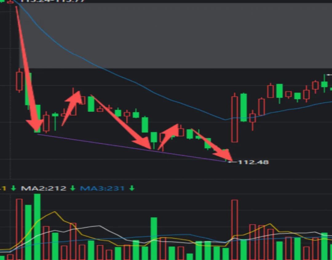 Brooks认为,市场会通过买卖双方的博弈去获得一个公平价格,基于这种博弈,市场会不断移动寻找公平的价格,以达成市场的目的:交易量最大化。如果市场处于下跌(上涨)且成交量萎靡的状态,市场可能会通过反弹或者横盘来寻找愿意交易的卖家(买家),而并非一味下跌(上涨)。市场可能会通过2-3次探底(探顶),来确认成交量确实是在下跌后,进行震荡或者反弹来寻找新的卖家(买家),常表现为三推楔形底部(顶部)。