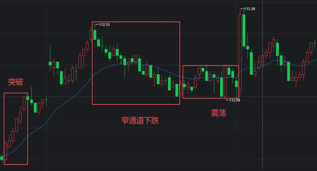 突破和窄通道在不同的周期是相通的,窄通道在更大周期的K线会表现为突破,突破在更小周期的K线会表现为窄通道。这两者为是较强的趋势,对于这两种趋势,交易员能做的只有一件事,即顺势交易。