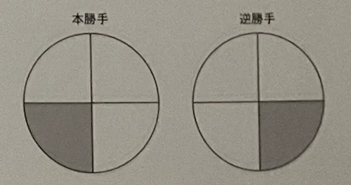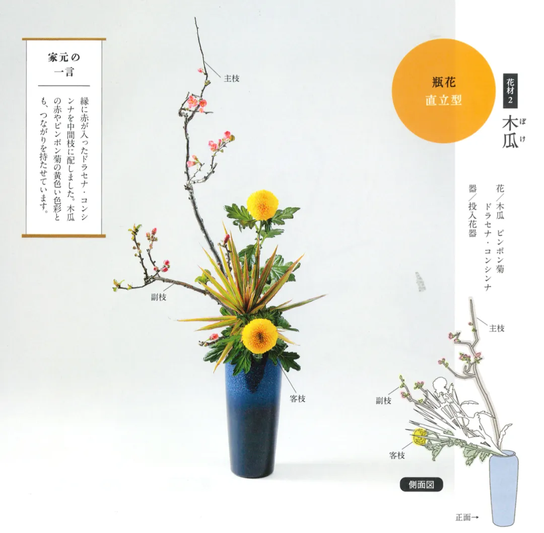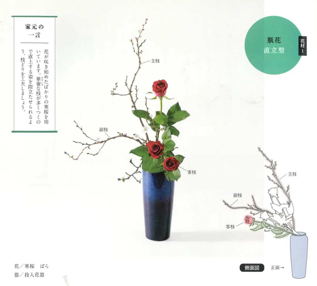 就像盛花会给圆水盘做个内接正方形一样,瓶花也有插点范围的范式。插制瓶花时,无论花器大小,需将器口四等分,按指定范围摆放花材,瓶口与留白的比例定为 1:3。瓶花同样分 “本胜手” 与 “逆胜手” 两种手法——左手边容器用本胜手,右手边用逆胜手,具体选用哪种,取决于花材情况与作品要摆放的位置。
