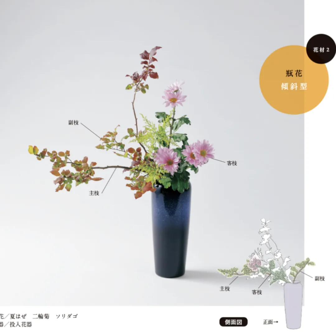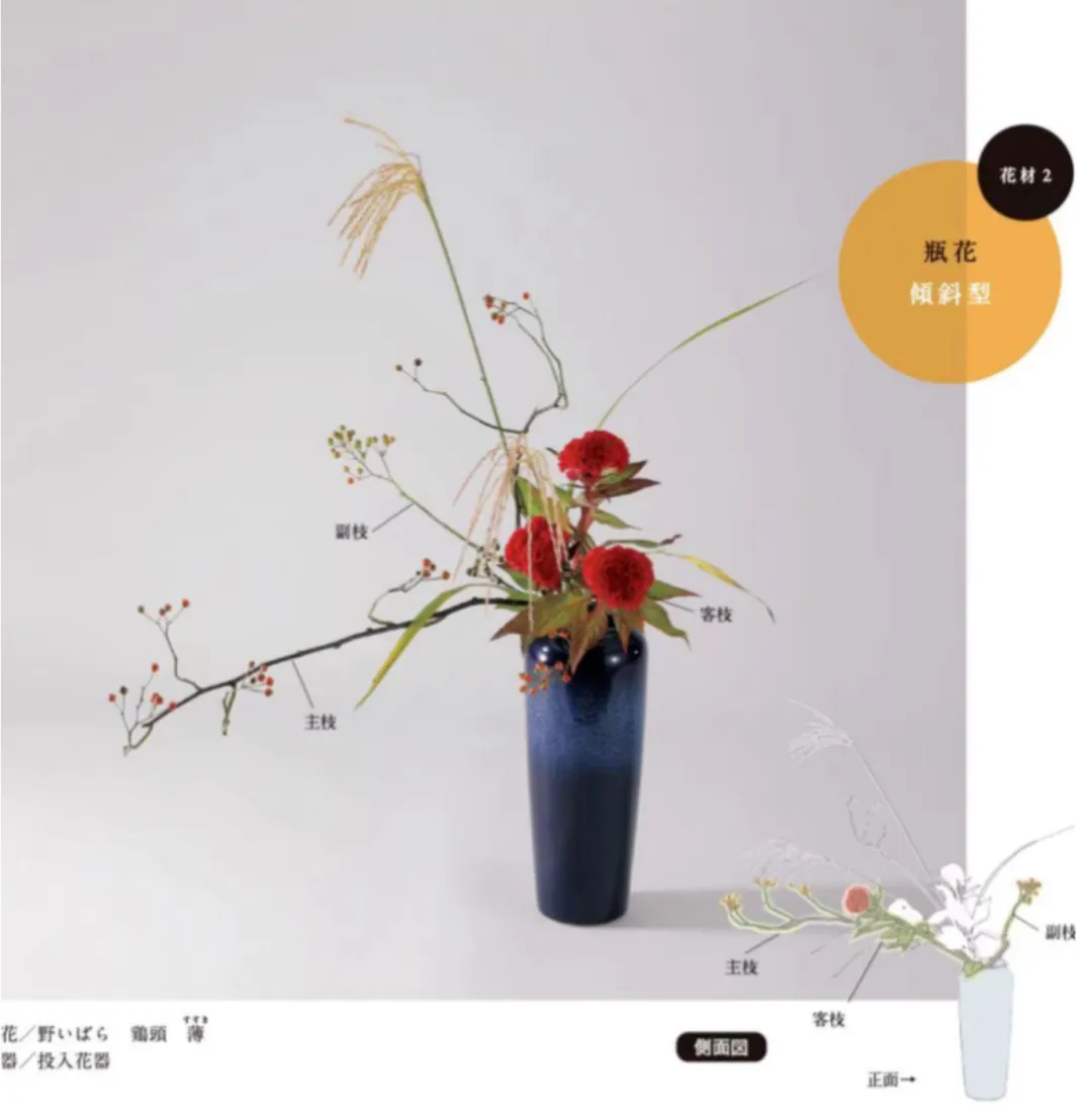 前面已经铺垫够了,本周开始瓶花了~在小花篮开始流行之前,我们对插花的认知更多是来自于瓶花。特别是要是没学花道,我可能都不知道还有盛花这个类别。小原流两大支柱:盛花、瓶花。瓶花的来源是 なげいれはな,成为“投入花”。可以认为瓶花就像自然地把花放进去,核心是不被固定程式束缚,最大程度还原花草自然姿态的插花理念,而非真的 “扔进去”。因此,瓶花是没有花留的。在这里,我们可以回顾一下我们花留使用的变化:剑山的全固定 - 七宝的半固定 - 瓶花无花留。也许这也是瓶花是师范科的内容的原因之一吧。小原流派的瓶花,传承了投入花自江户时代起便被推崇的风雅意趣,融入了被称作 “文人” 的文人花精神。从后面我们的瓶花作品中,也可以感受到瓶花特别的“风骨”。瓶花也有直立型、倾斜型,不同的是它没有水可以观,但可以下垂。花器:盛花使用平面容器,而瓶花则采用瓶、壶这类高身容器。