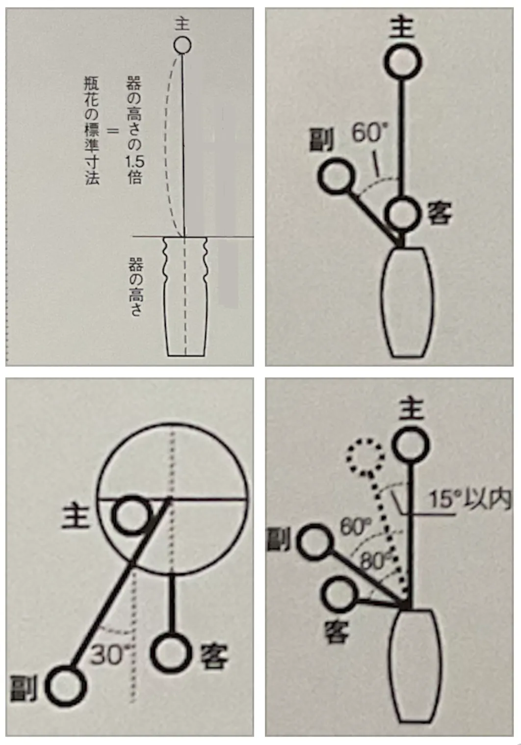 瓶花的主枝尺寸,以从瓶口向上伸出的部分来计算。插入瓶内的部分,会根据容器高度、固定方式、枝条特性等因素有所不同,没有特别的规定。因此,在确定主枝尺寸时,必须提前考虑好插入瓶内的部分长度。(看,没有前面学习的积累,到瓶花这量个长度都抓瞎)- 客:主的1/2,向前80度,一般如图所示(形成这1/4区域的最大的三角形)(一般会比较正,不太往左右倾。因此客枝可以作为中轴,用于校准)