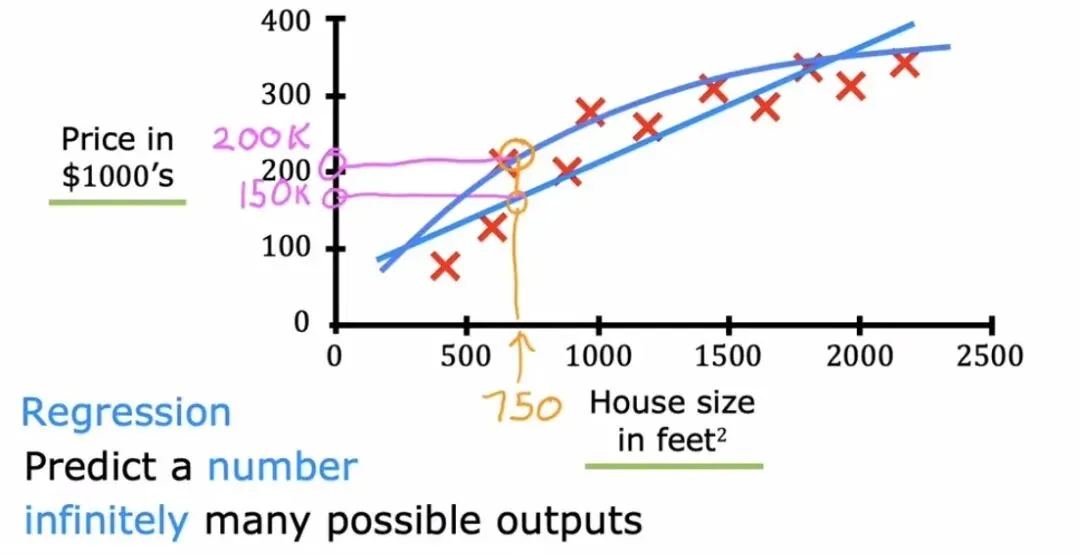 监督学习内部根据输出类型的不同,又可以划分为两大阵营。如果输出是一个连续的数值,比如房价是350万、某天的气温是26.5摄氏度,我们称之为回归(Regression)问题。如果输出是一个离散的类别标签,比如判断一封邮件是不是垃圾邮件、识别一张图片里是猫还是狗,我们称之为分类(Classification)问题。