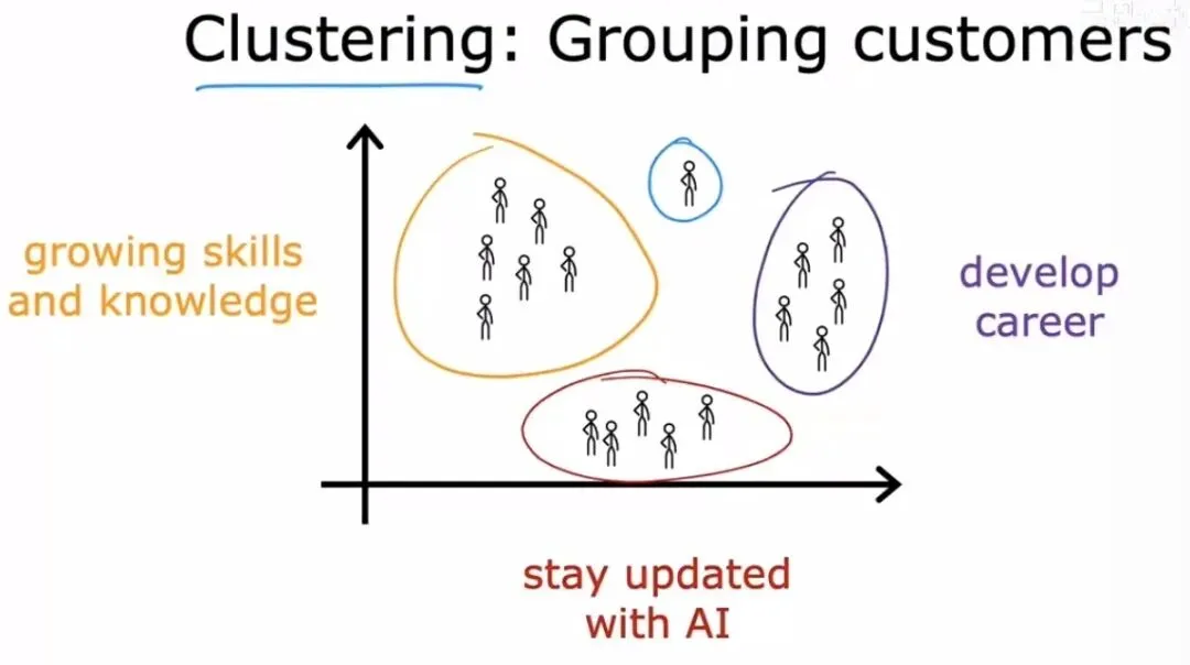 无监督学习的玩法则完全不同。此时我们不再拥有所谓的标准答案,算法需要自己睁大眼睛,去数据中寻找那些有趣的模式或结构。最常见的无监督学习任务是聚类(Clustering),它会将数据点自动划分成若干个簇,使得同一簇内的点彼此相似,而不同簇的点差异较大。
