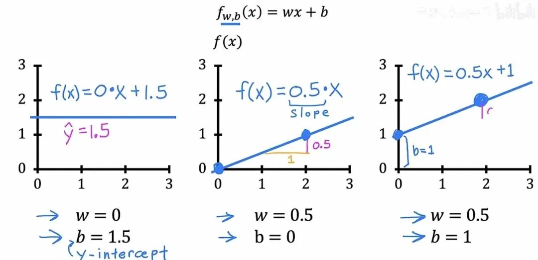 这里的 和 是模型的参数(Parameters), 常被称为权重(Weight),控制着直线的斜率; 常被称为偏置(Bias),控制着直线的截距。机器学习训练的过程,本质上就是在寻找一组合适的 和 ,使得这条直线能够最好地拟合训练数据。