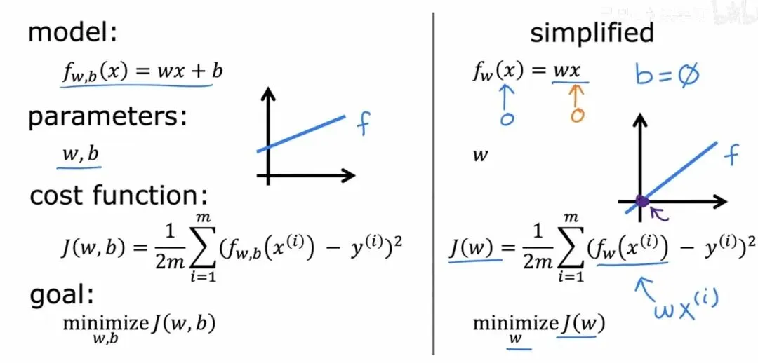 那么问题来了,这个函数应该长什么样?对于最简单的情况——只有一个输入变量的线性回归,我们将其称为单变量线性回归(Univariate Linear Regression)。函数的形式可以写成:
