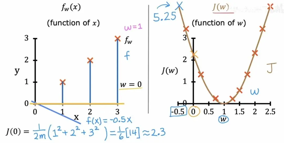 代价函数是关于参数和的函数。需要做的事情非常明确,找到让取到最小值的和。为了建立直观感受,我们不妨先简化一下问题,假设偏置固定为 0,只考虑参数。此时模型变成了,代价函数变成了。当时,如果预测值和真实值恰好完全吻合,那么;当时,所有预测值都只有真实值的一半,误差累积起来,就会是一个大于 0 的数。如果把不同对应的值画在二维平面上,可以得到一个开口向上的抛物线。