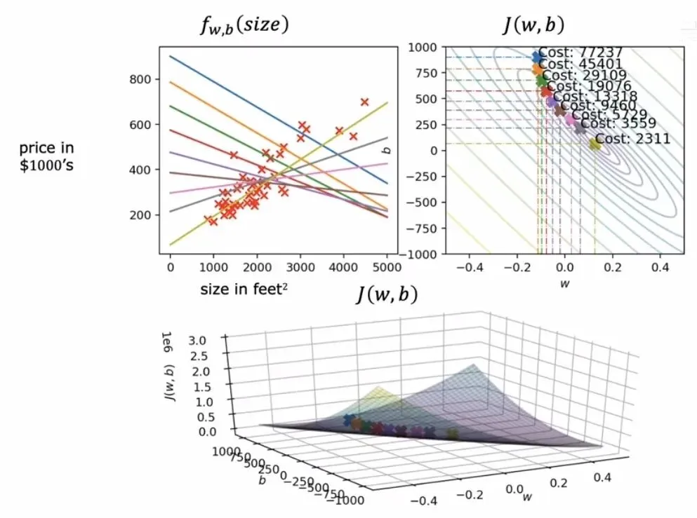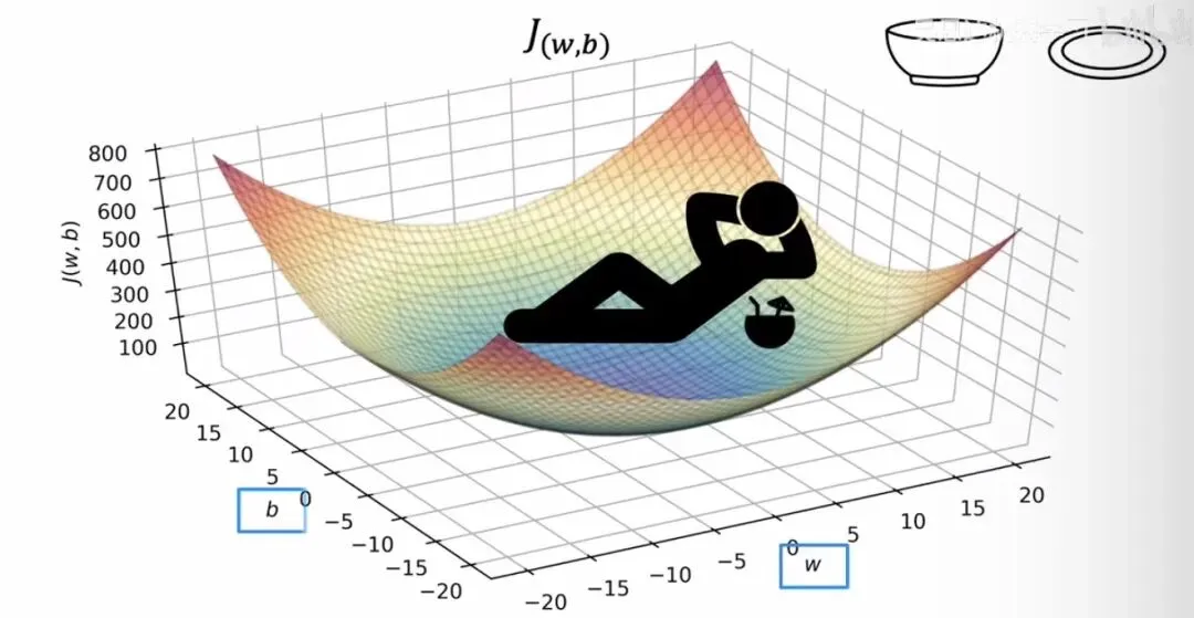 二维代价函数与模型对应关系当两个参数和同时存在时,代价函数就变成了一个三维空间中的曲面。想象一片微微起伏的丘陵,它的形状像一只被拉长的碗。