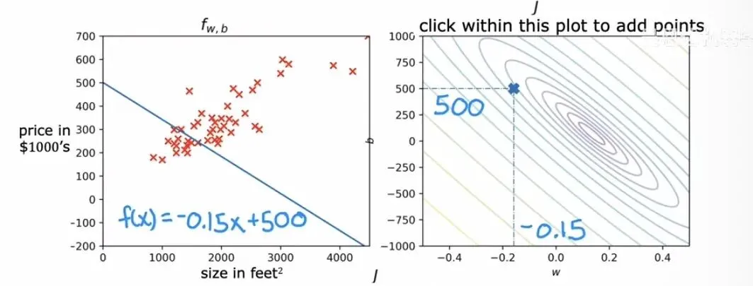代价函数等高线图我们可以通过等高线图来直观判断当前参数离最优解还有多远。比如下图中的情况,参数取值是,对应的拟合直线斜向下,与数据点向上的整体趋势背道而驰。从等高线图上看,这组参数落在了一个远离中心椭圆圈的边缘位置,说明代价函数的值还相当大,模型还有很大的优化空间。