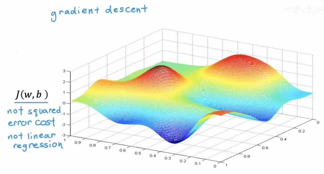 深度学习中常见的复杂代价函数上图展示了一个在深度学习中可能遇到的代价函数曲面,它不再是简单平滑的碗状,而是布满了起伏的山峰和深邃的峡谷。由于初始点的位置不同,梯度下降可能会将你带到不同的局部极小值点,这也是优化过程中一个需要关注的问题。