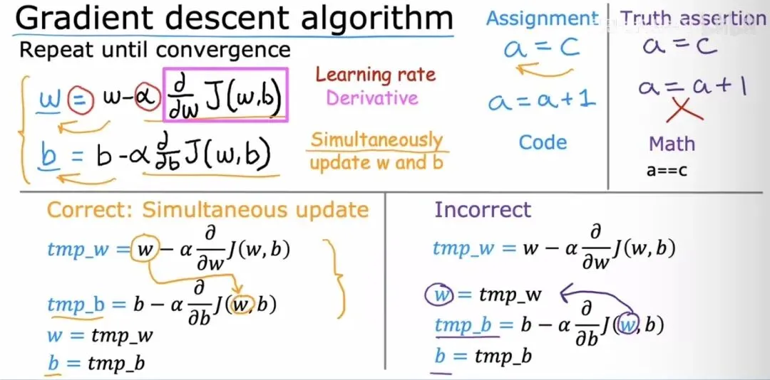 在实现梯度下降时有一个至关重要的细节:必须同时更新和。正确做法是先分别计算两个临时值: