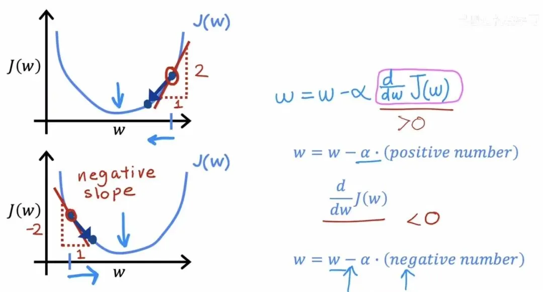 正确与错误的参数更新方式为了理解导数项究竟是如何引导参数向最小值移动的,我们可以看一个只含的简化情况。假设代价函数是一条开口向上的抛物线,在某一点处,如果切线斜率为正(导数大于 0),根据更新公式,会减去一个正数,于是变小,向左移动靠近谷底。反之,如果切线斜率为负(导数小于 0),减去一个负数等价于加上一个正数,变大,向右移动靠近谷底。导数项就像一个自动导航仪,时刻根据当前位置的坡度,将参数推向代价更低的方向。