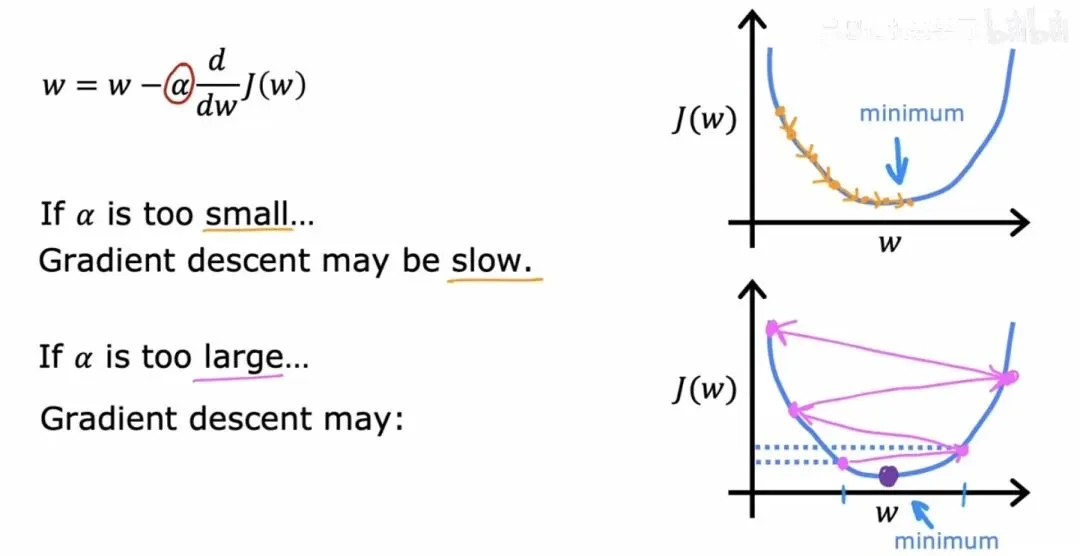 导数项如何引导参数移动学习率的选取对梯度下降的表现有着举足轻重的影响。如果选得太小,每一步迈得谨小慎微,虽然最终能到达谷底,但下降过程会极其缓慢,耗费大量的计算资源。如果选得太大,则可能用力过猛,一步直接跨过谷底,甚至在谷底两侧来回剧烈震荡,代价函数的值不仅不降反而可能越弹越高,永远无法收敛。