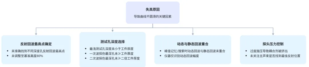 - 曲线失真主要源于最高点定位不准及仪器动态回波识别问题,制作时需注意测试孔深度选择。