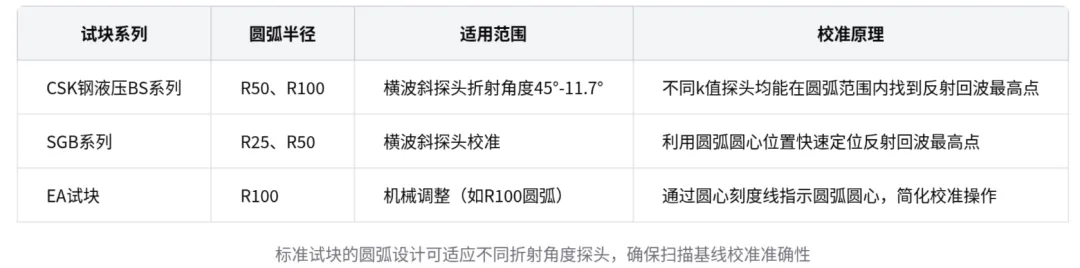 - 校准原理与试块选择:扫描基线校准是超声探伤第一步,校准前扫描基线不准,校准后可起到尺的作用。常用 CSK 钢液压 BS 系列、SGB 系列标准试块上半径 R50、R100、R25 圆弧进行校准,因为不同 k 值探头在这些圆弧范围内能找到反射回波最高点,适应横波斜探头常用折射角度范围(45 度 - 11.7 度)。