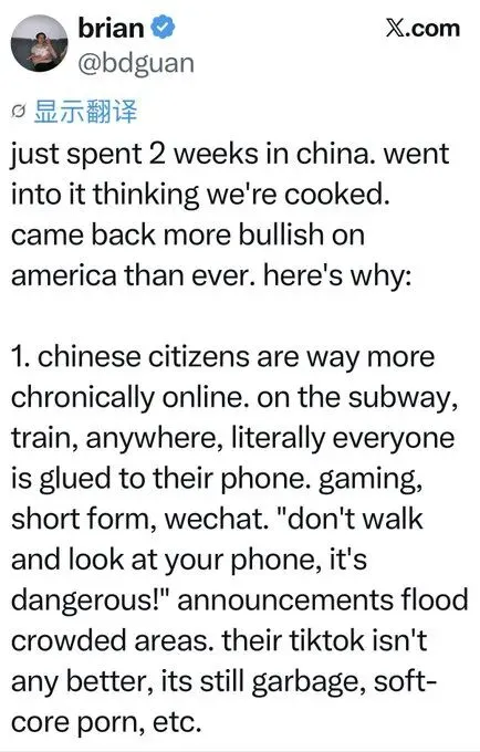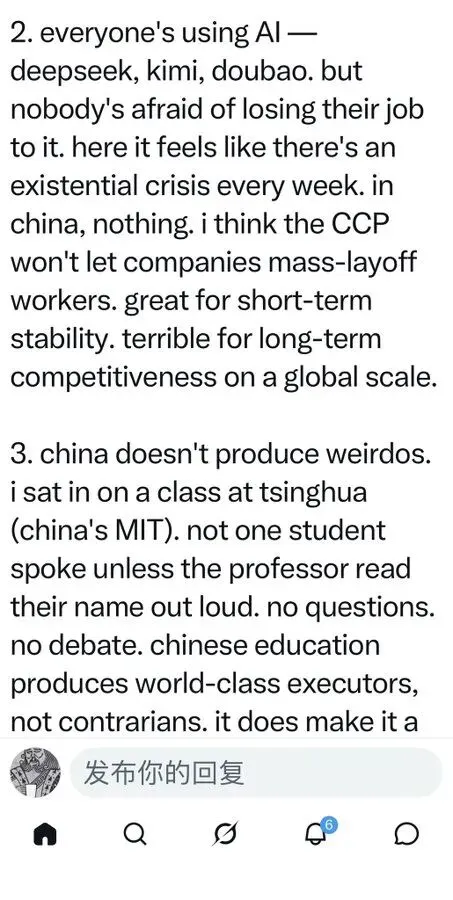 2. 每个人都在用AI——DeepSeek、Kimi、豆包。但没人担心被AI抢了饭碗。在这里,每周都像有生存危机。在中国,完全没有。我觉得中共不会让公司大规模裁员。这对短期稳定很好。对全球范围内的长期竞争力来说,却很糟糕。