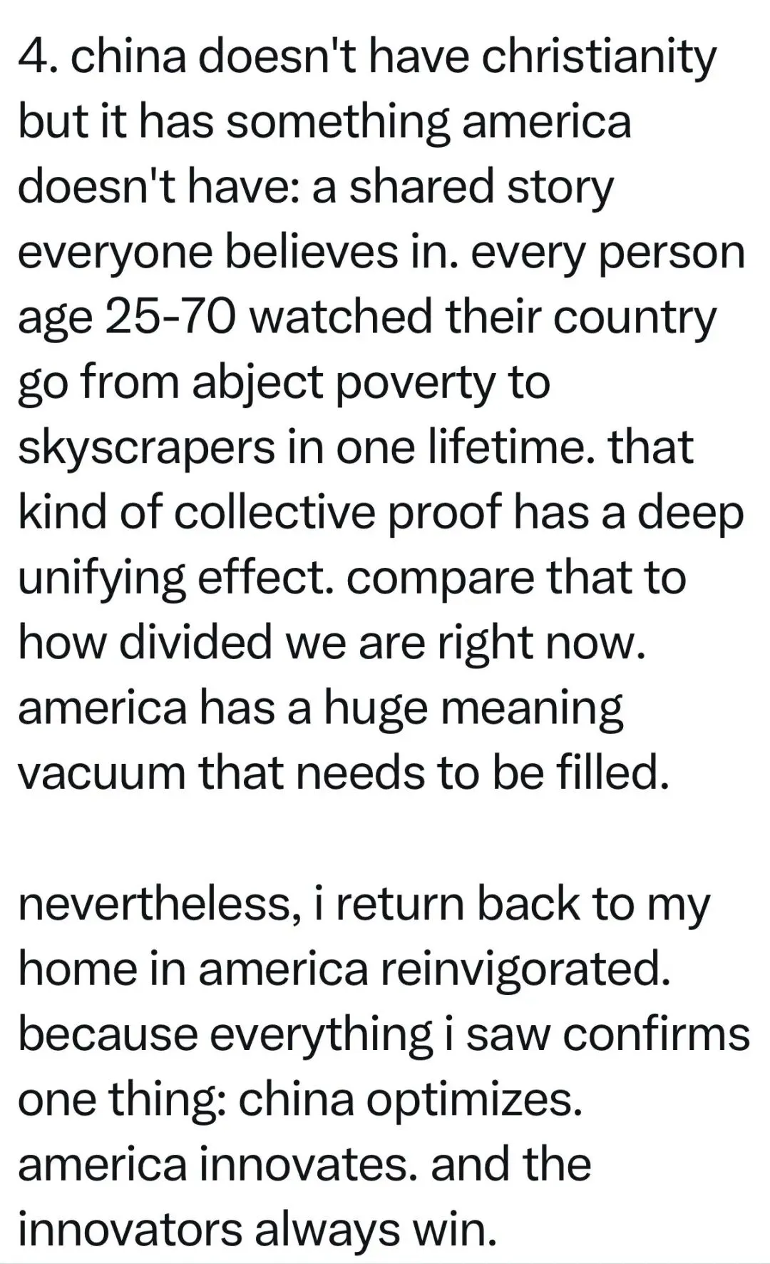 4. 中国没有基督教,但它有美国没有的东西:一个每个人都相信的共同故事。每一个人,从25岁到70岁,都亲眼见证了自己的国家在一生中从赤贫走向摩天大楼。这种集体见证有着深刻统一的效应。相比之下,我们现在是多么分裂。美国有一个巨大的意义真空,需要被填补。