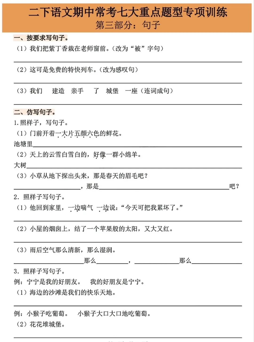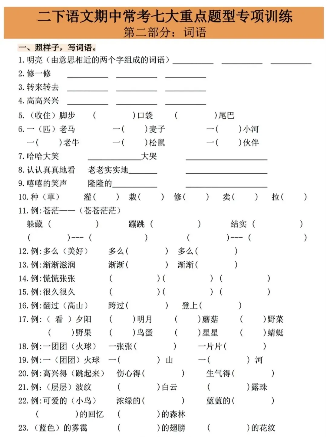 >【学习资料分享】二下语文 期中常考的七大重点题专项训练(二、三)