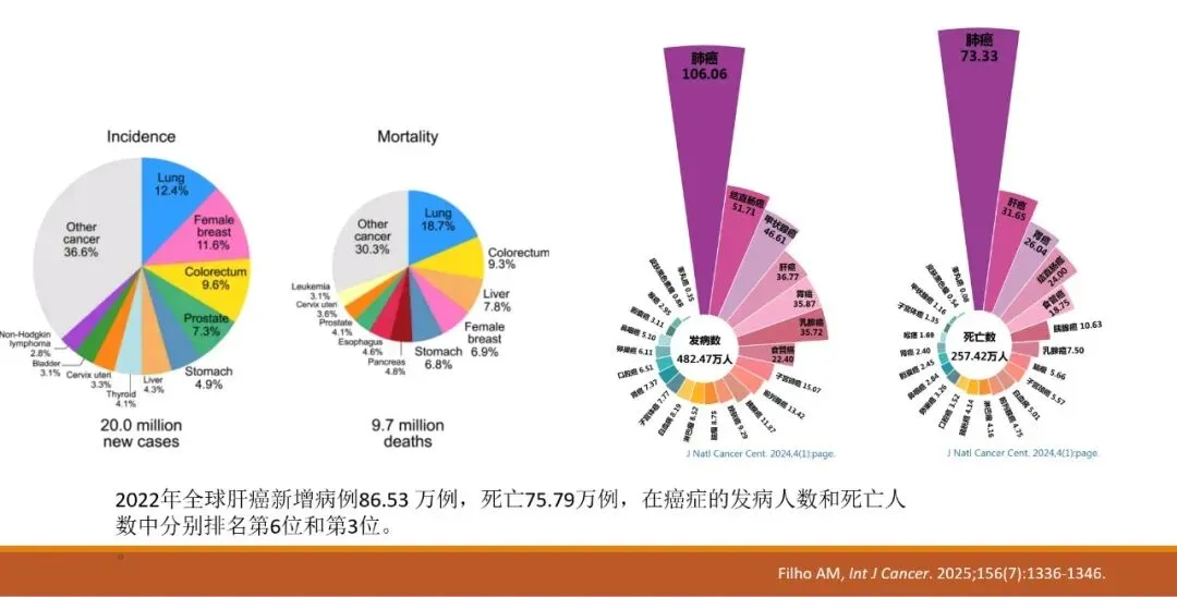 2022年,原发性肝癌在全球范围内新增86.53万例,占全球癌症新增病例总数的4.3%,是第六大常见癌症。同年,肝癌导致75.79万人死亡,位列癌症死因第三位,占全球癌症死亡总数的7.8%。在中国,肝癌是第四位高发恶性肿瘤(年新增约36.77万例),但却是第二位癌症致死原因(年死亡约31.65万例),疾病负担极为沉重。